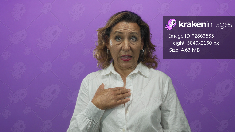 Middle age hispanic woman bare hand on chest gesture with open mouth and raised brows in purple studio; surprise.