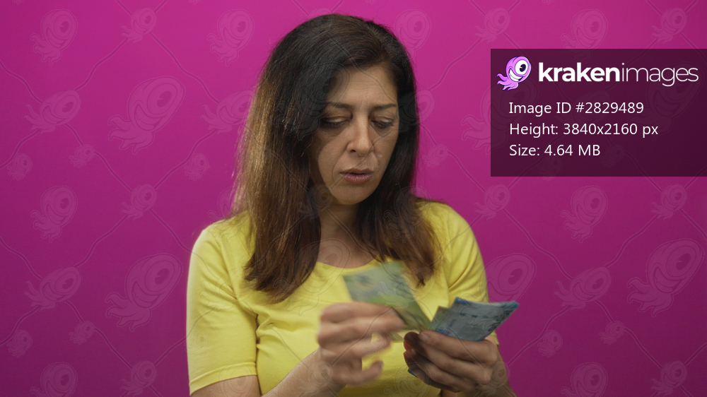 Middle age hispanic woman counting chilean pesos in studio setting with vibrant magenta background; financial worry.