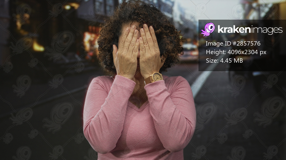 Middle age hispanic woman covers face with hands on city street then lifts hands to reveal smile and playful gestures; playful warmth.
