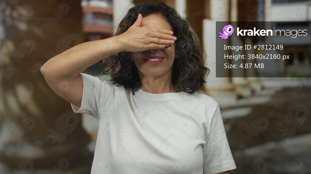Middle age hispanic woman covers her eyes with hand on sunlit old town street outdoors; playfulness surprise.