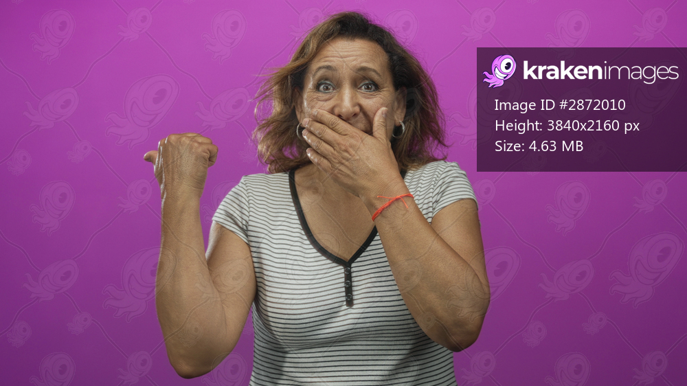 Middle age hispanic woman covers mouth with hand and raises eyebrows and makes direct eye contact in purple studio; silence secrecy concealment privacy. - Kraken Images
