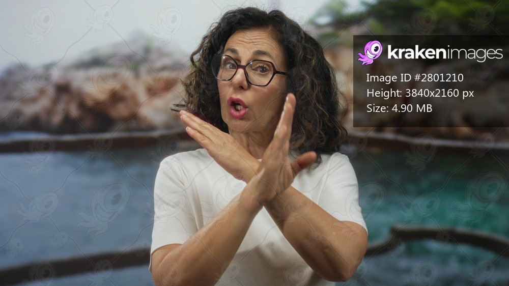 Middle age hispanic woman crosses arms in rejection gesture on rocky beach; denial refusal stubbornness.