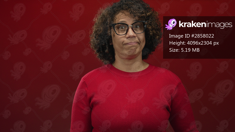Middle age hispanic woman with curly hair and glasses pointing finger to temple in red studio; thoughtful reflection.