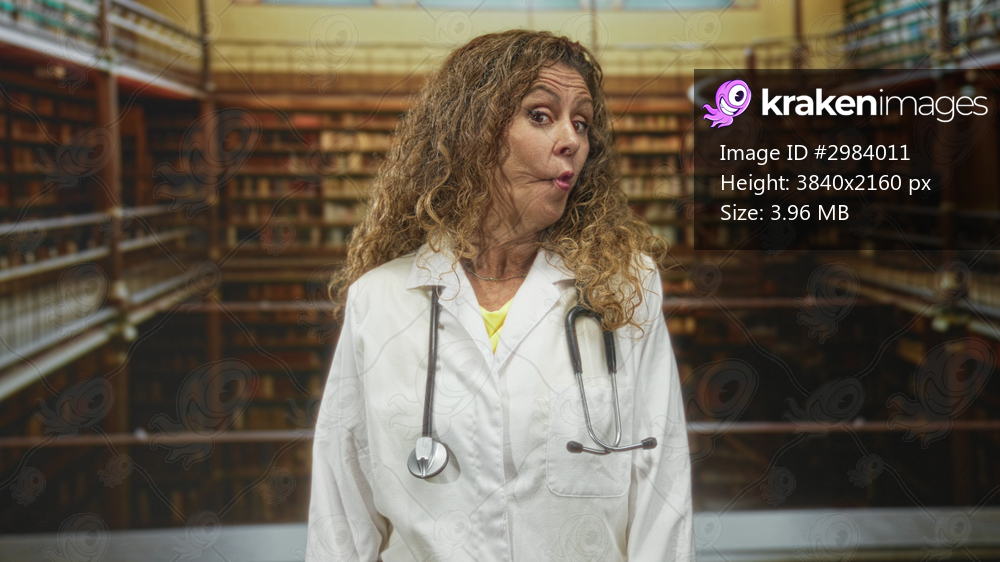 Middle age hispanic woman doctor in white coat with stethoscope, pursed lips and side glance in a library building; curiosity whimsy.