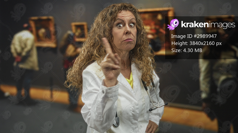 Middle age hispanic woman doctor with stethoscope smiling and hands on hip in museum building gallery; care confidence.