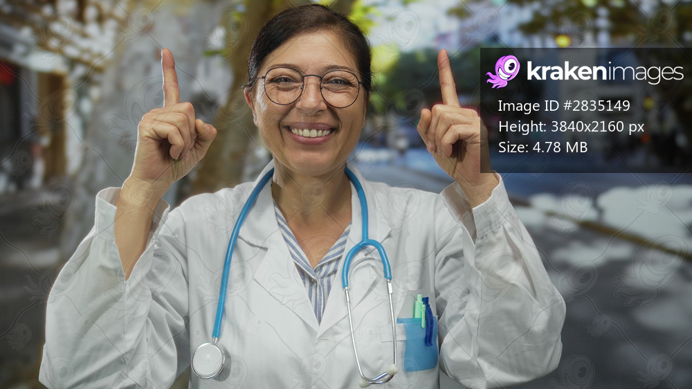 Middle age hispanic woman doctor wearing stethoscope pointing both index fingers upward on busy street; confidence.