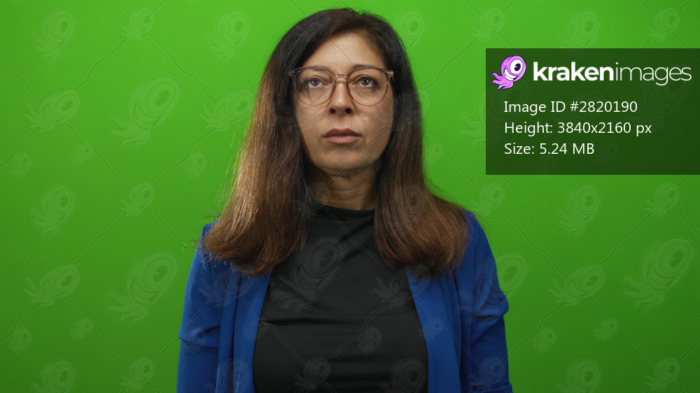 Middle age hispanic woman with eyes closed praying with pressed hands in studio with green background; serenity.