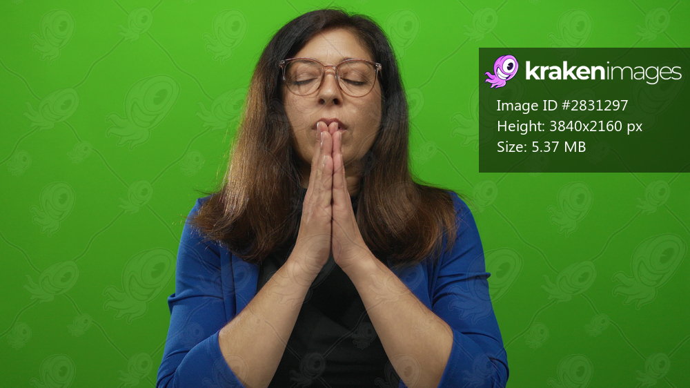 Middle age hispanic woman with eyes closed praying with pressed hands in studio with green background; serenity.