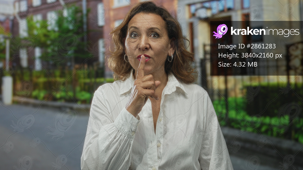 Middle age hispanic woman finger to lips for silence on city street near gate and townhouse buildings; secrecy hush restraint.