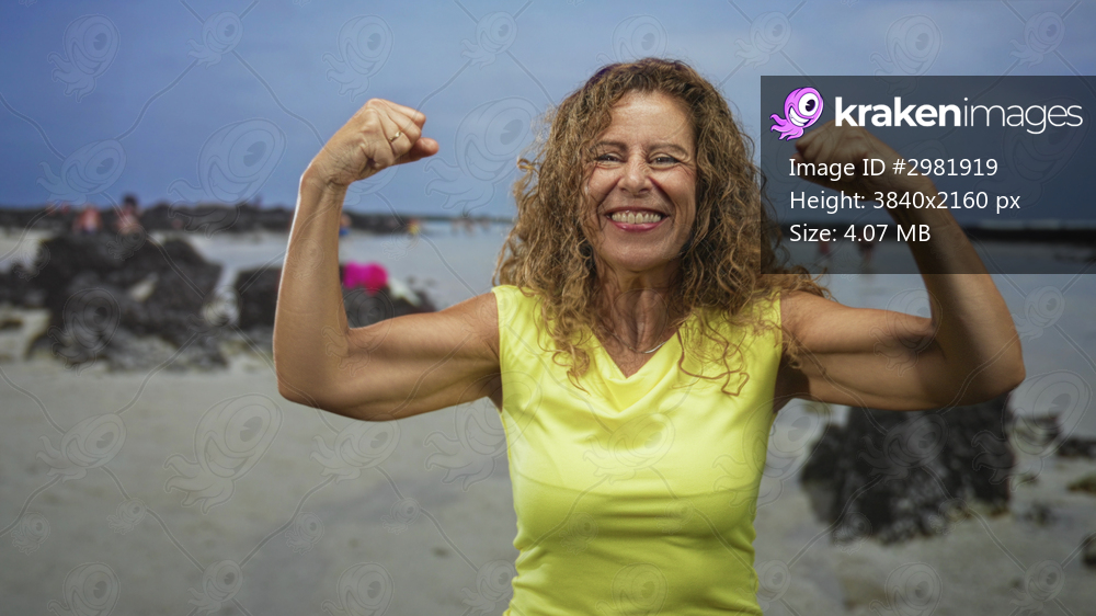 Middle age hispanic woman flexing both biceps at beach in yellow sleeveless top, smiling with raised arms; confidence healthy aging.