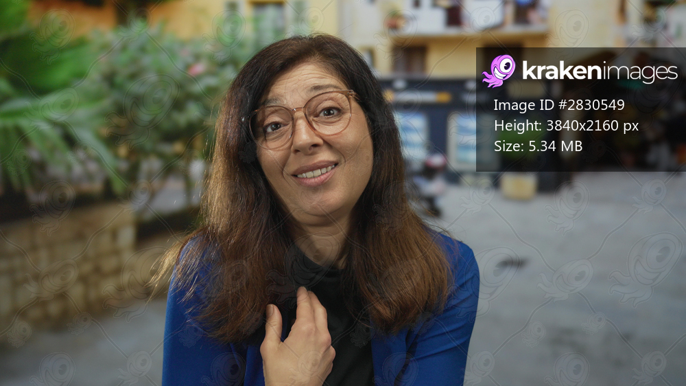 Middle age hispanic woman gestures with open palm and pointing finger to chest on city street; confusion.