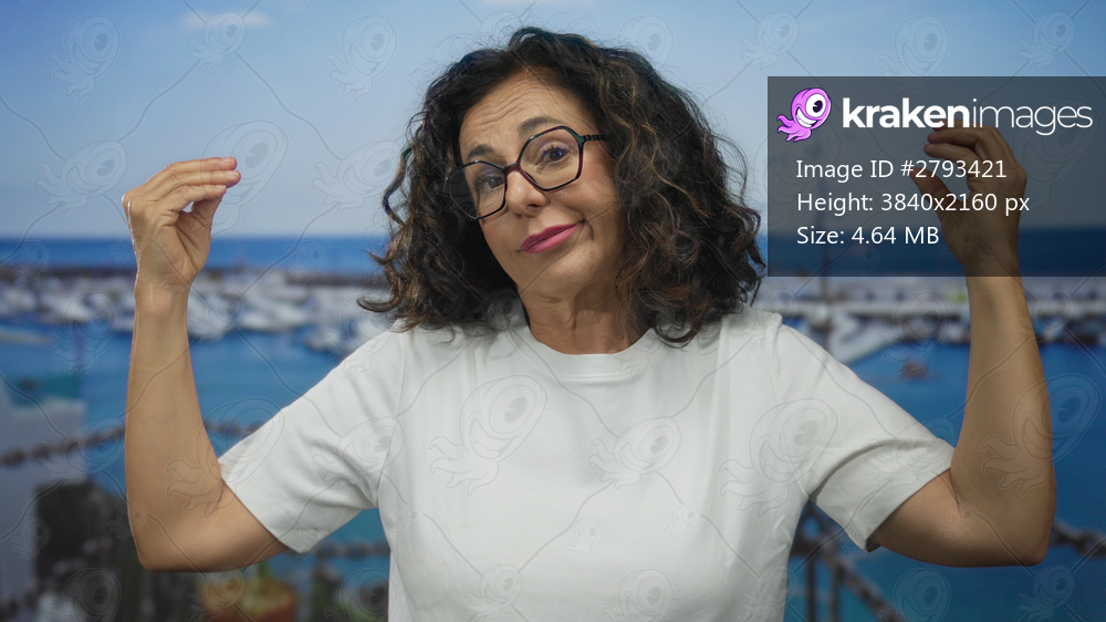 Middle age hispanic woman gesturing with hands at port; communication expression storytelling connection.