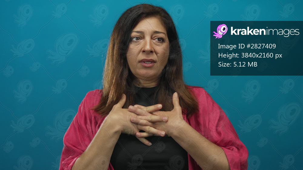 Middle age hispanic woman with hand on chin holding her wrist in a blue studio wearing a pink jacket; nervousness.