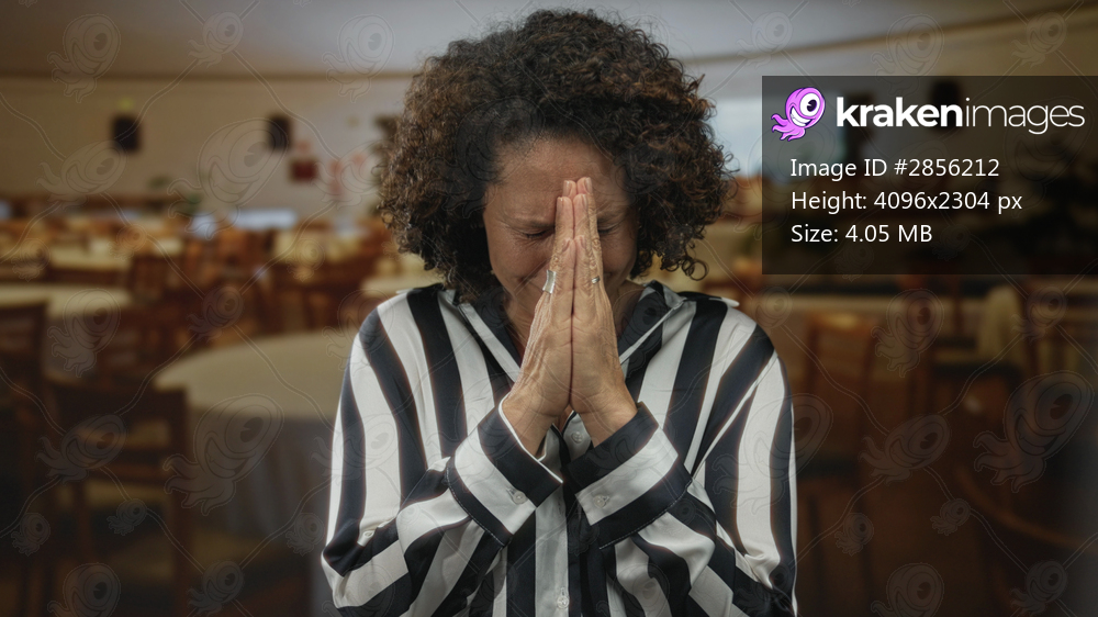 Middle age hispanic woman hands pressed together in prayer at a casual restaurant building; gratitude.