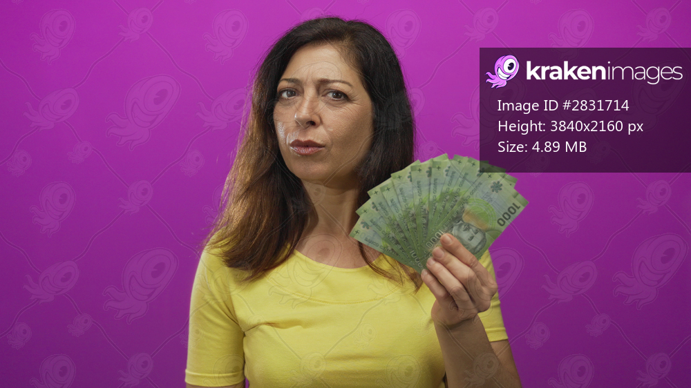 Middle age hispanic woman holding a fanned bundle of chilean peso notes against a purple backdrop at a studio; surprise wealth.