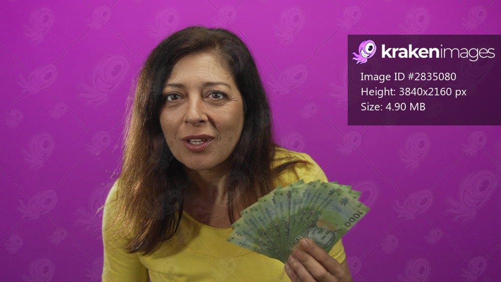 Middle age hispanic woman holding a fanned bundle of chilean peso notes against a purple backdrop at a studio; surprise wealth.