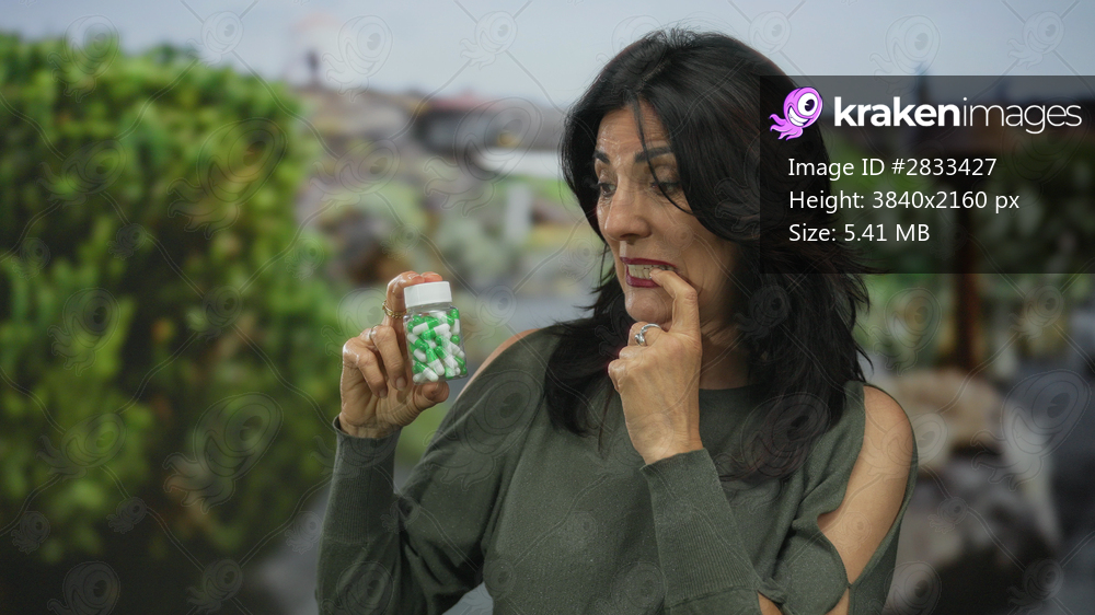 Middle age hispanic woman holding green pill bottle with finger on chin in sunlit forest; health concern.