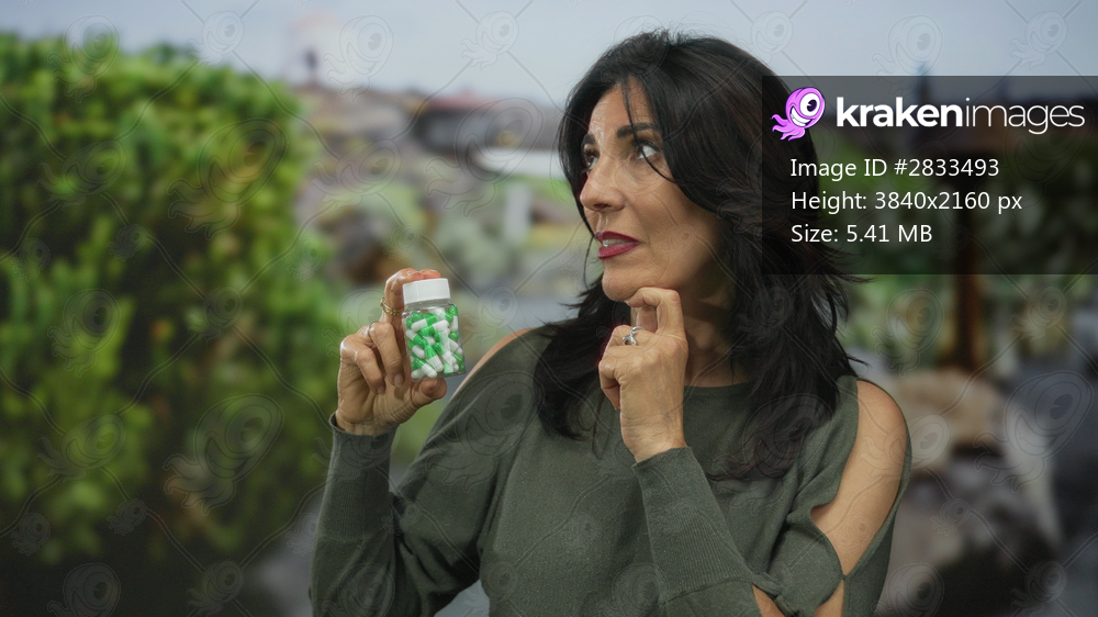 Middle age hispanic woman holding green pill bottle with finger on chin in sunlit forest; health concern.