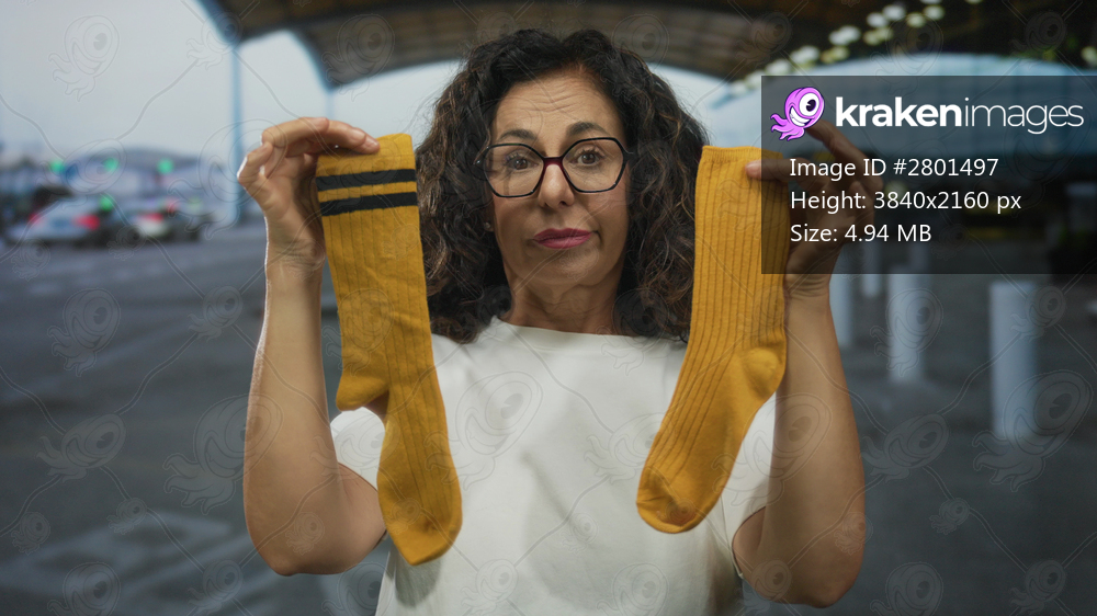 Middle age hispanic woman holding mismatched yellow socks with concerned expression in airport terminal; confusion frustration inconvenience embarrassment.