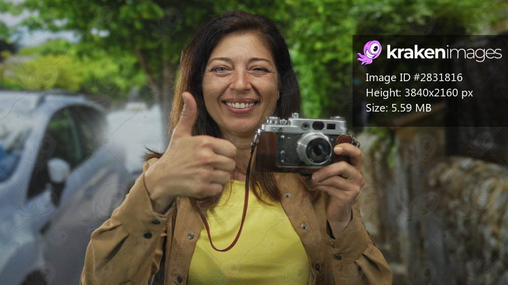Middle age hispanic woman holding vintage rangefinder camera shows thumbs up gesture on street near parked car; approval.