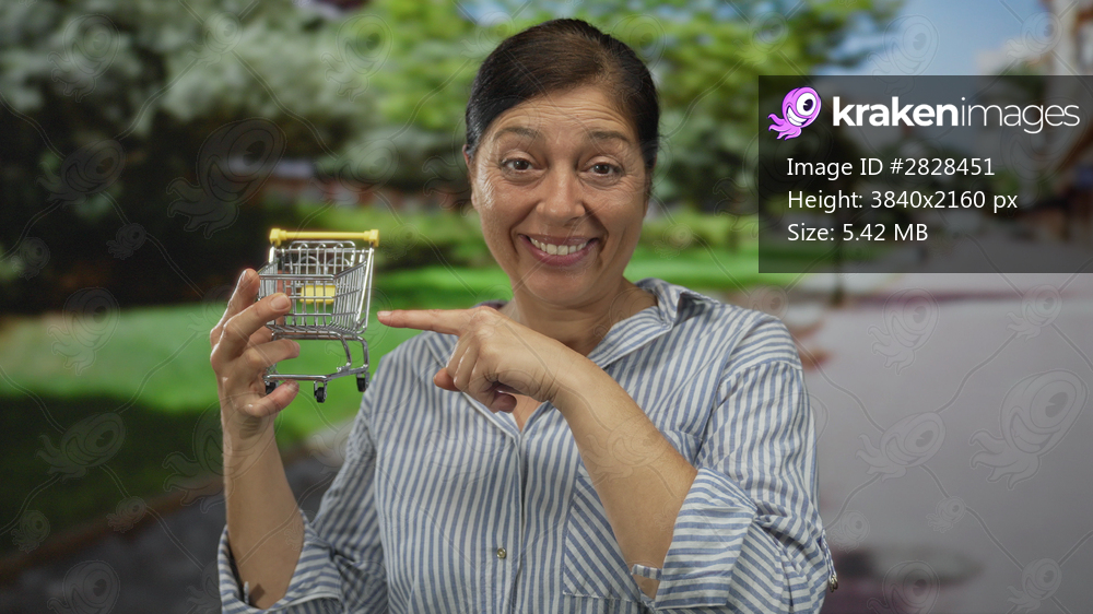 Middle age hispanic woman holds cart and points finger to cart on street; happiness shopping.