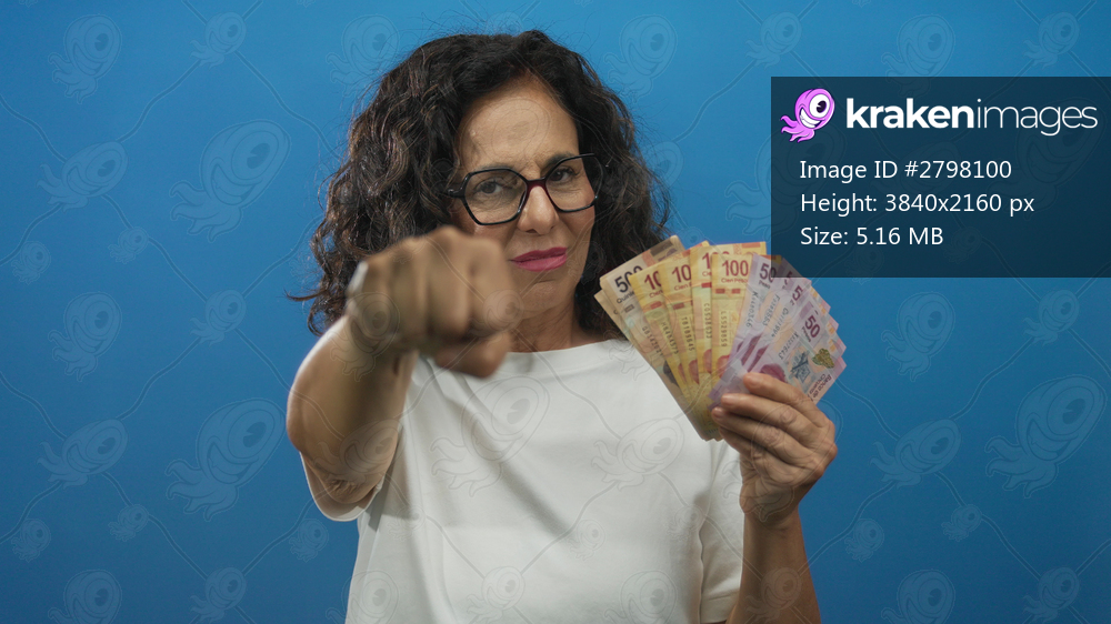 Middle age hispanic woman holds mexican pesos banknotes and extends fist to camera in blue studio; defiance empowerment.