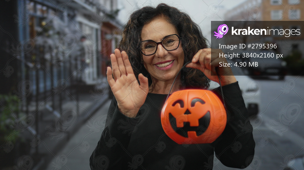 Middle age hispanic woman holds pumpkin basket and waves to camera on street; festivity celebration holiday fun.