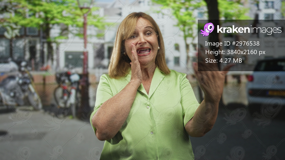 Middle age hispanic woman in green shirt with hand to cheek, gesturing and speaking on street near bicycles and car; surprise conversation.