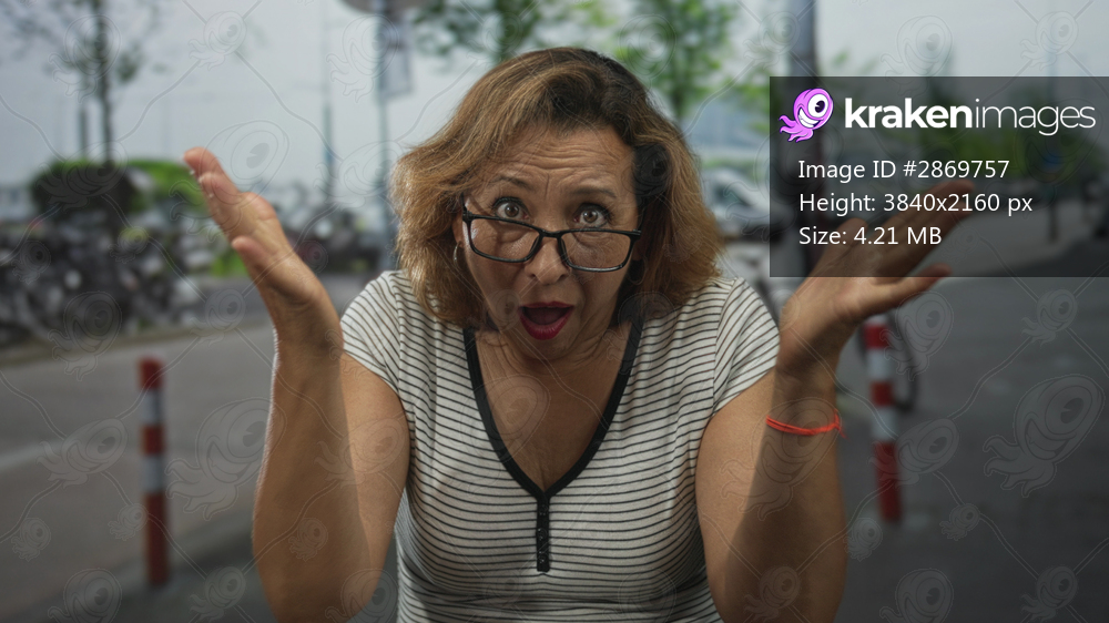 Middle age hispanic woman in striped shirt adjusts glasses on city street lined with parked bicycles and bollards; surprise curiosity.