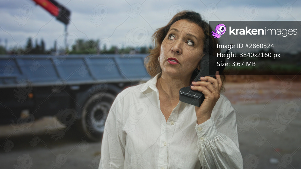 Middle age hispanic woman in white shirt holding cellphone to ear on street looking upward; uncertainty.