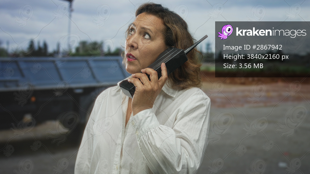 Middle age hispanic woman in white shirt holding cellphone to ear on street looking upward; uncertainty.