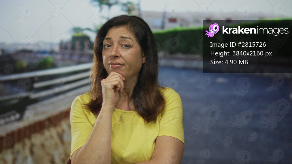 Middle age hispanic woman in yellow shirt resting chin on hand with thoughtful expression on busy city street; introspection reflection contemplation thought. - Kraken Images