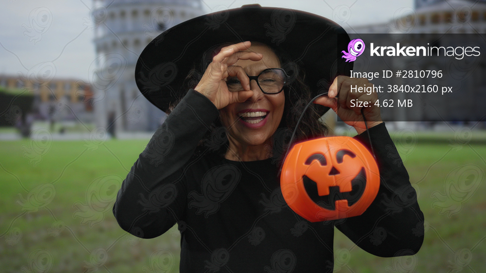 Middle age hispanic woman makes ok sign with right hand before eye on pisa tower street holding a pumpkin bucket for halloween; approval fun.