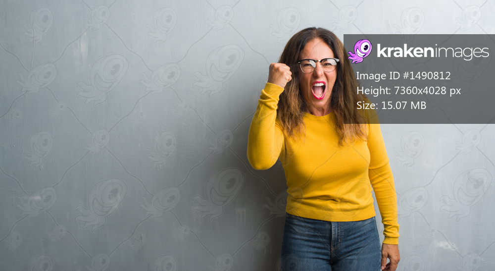 Middle age hispanic woman over grey wall wearing glasses angry and mad raising fist frustrated and furious while shouting with anger. Rage and aggressive concept. - Kraken Images