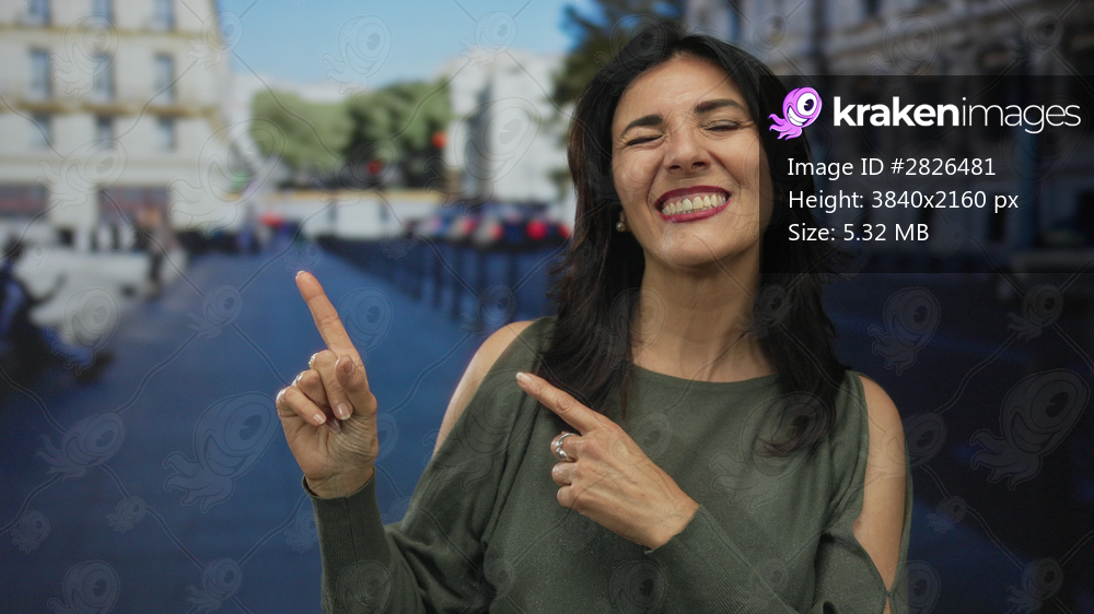 Middle age hispanic woman pointing finger on sunlit city street with blurred buildings in the background; optimism.