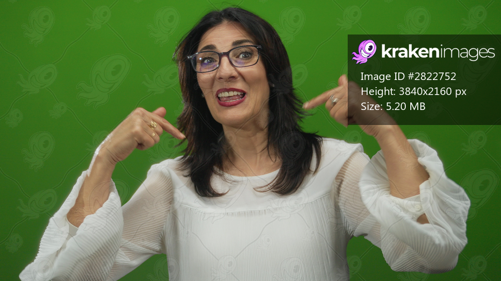 Middle age hispanic woman pointing finger to herself with friendly smile and wide grin in green studio; confidence.