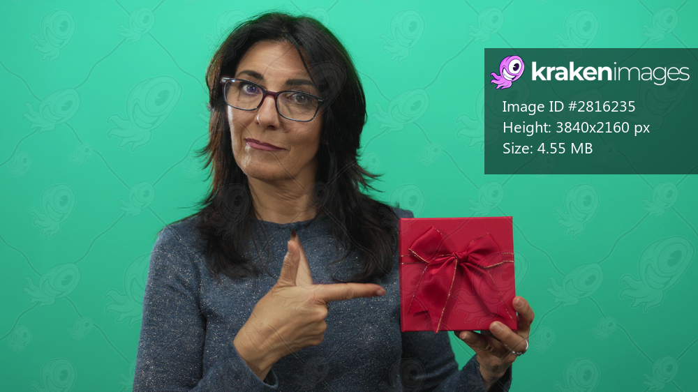 Middle age hispanic woman pointing finger to red gift box held at chest level in a green studio backdrop; celebration.