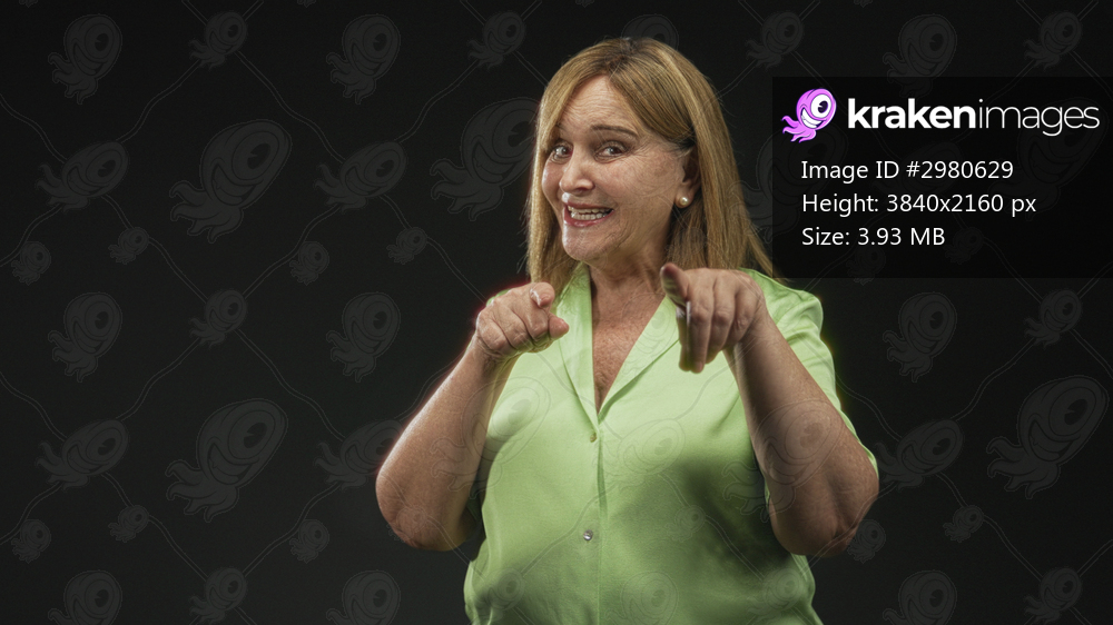 Middle age hispanic woman pointing fingers at camera, smiling and showing fingers in a green blouse in studio; playful confidence.