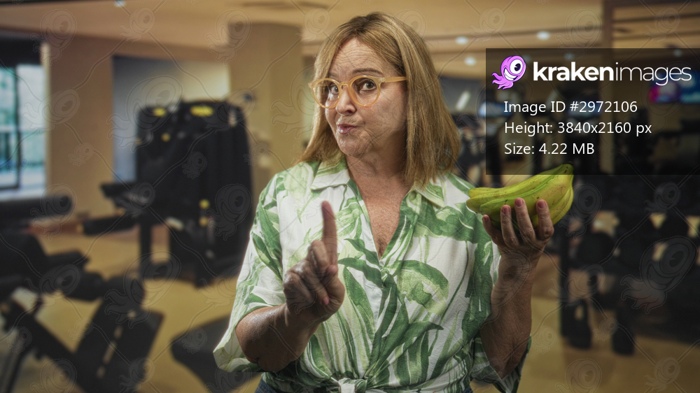 Middle age hispanic woman points finger while holding bananas and shows bare hand in gym building; caution nutrition advice.