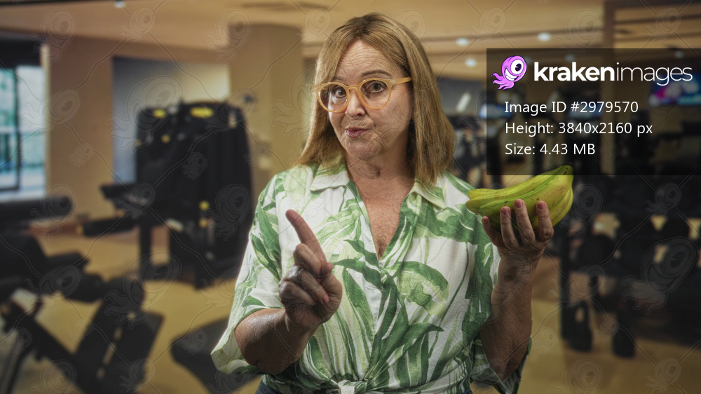 Middle age hispanic woman points finger while holding bananas and shows bare hand in gym building; caution nutrition advice.