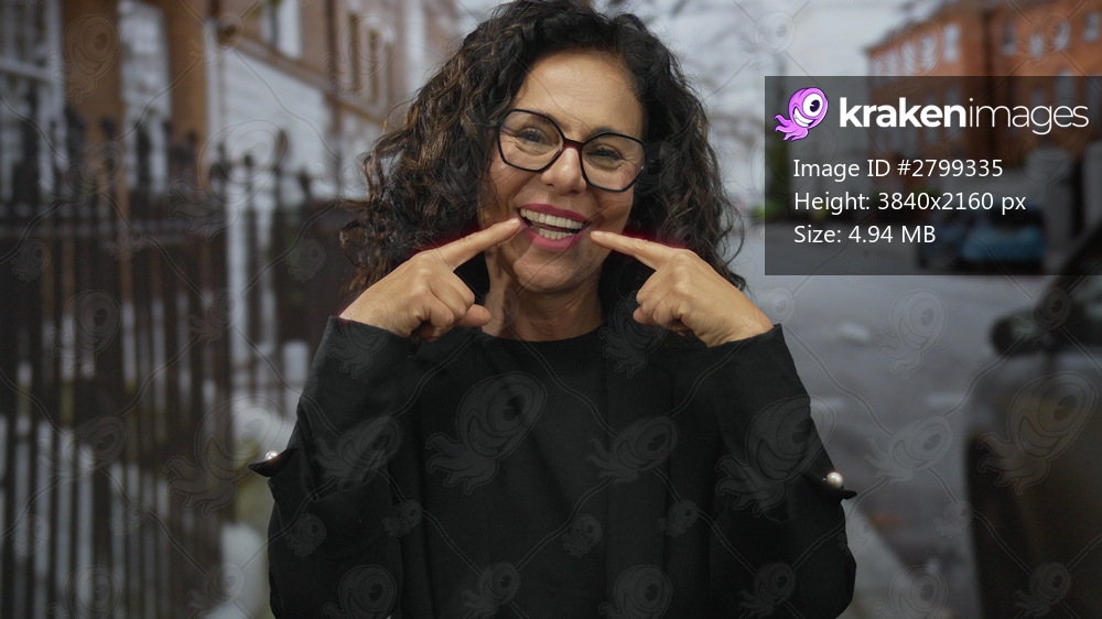 Middle age hispanic woman points index fingers to lips for silence on a city street; quiet playful secrecy hush.
