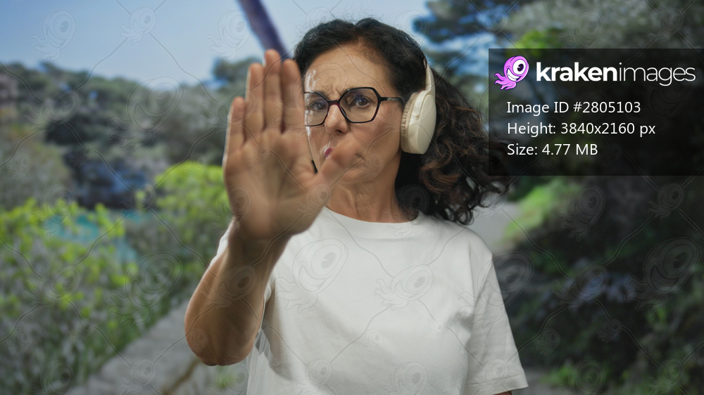 Middle age hispanic woman raises hand palm facing forward in a green park walkway; assertion boundary respect.