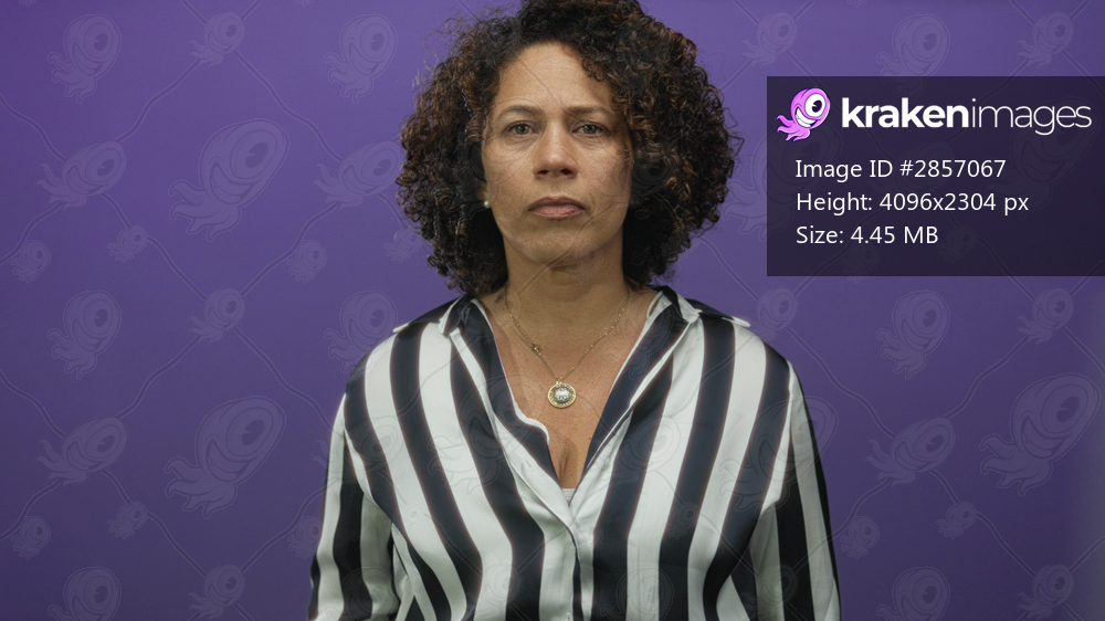Middle age hispanic woman raising fist in purple studio with serious expression; determination strength.