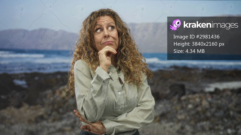 Middle age hispanic woman resting chin on hand in pensive pose at rocky beach with waves and cliffs; thoughtful reflection.