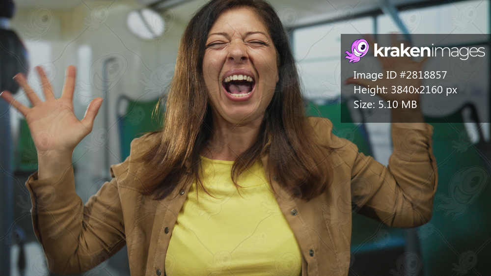 Middle age hispanic woman screams with open mouth and raised hands inside a bus on street; excitement.