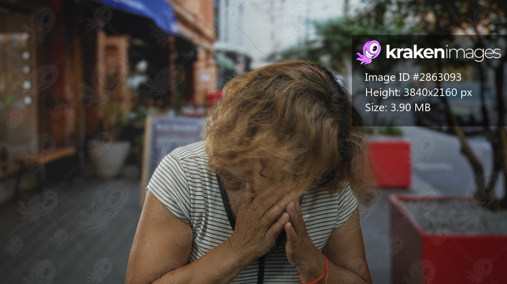 Middle age hispanic woman sneezing with hands over mouth on urban street with red planters and trees, wearing glasses and striped top; surprise health concern. - Kraken Images