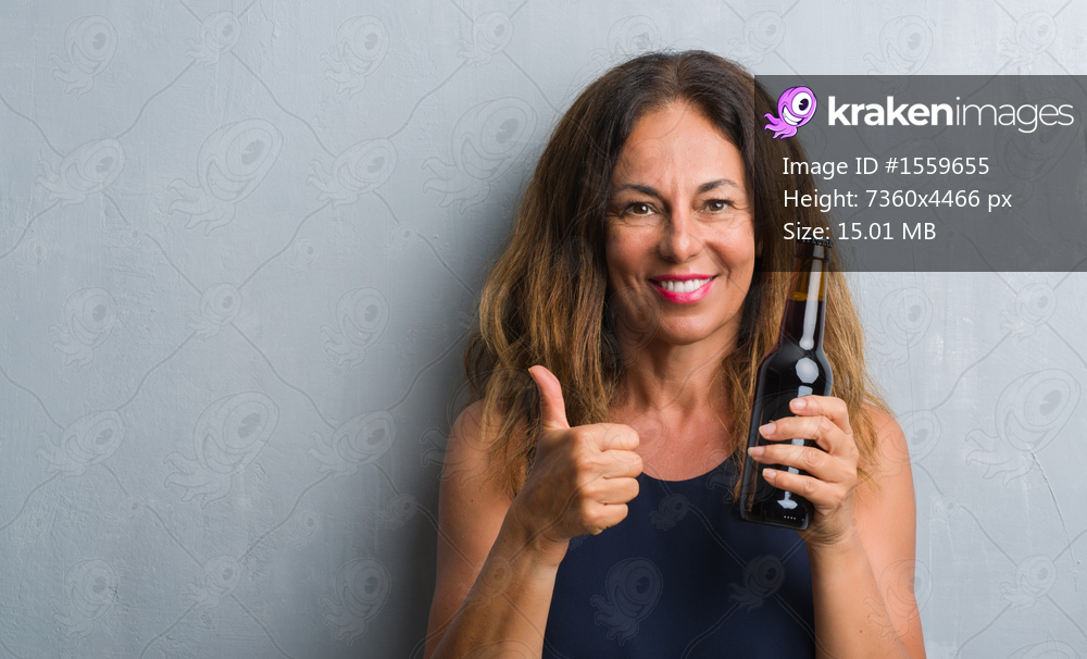 Middle age hispanic woman standing over grey grunge wall holding beer bottle happy with big smile doing ok sign, thumb up with fingers, excellent sign