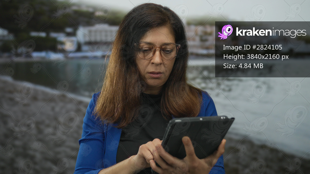 Middle age hispanic woman taps tablet with finger while sitting on sandy beach by seaside waterfront; focused concentration.