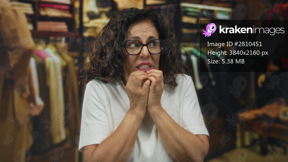 Middle age hispanic woman visibly biting her nails inside clothing store while wearing glasses; fear anxiety.