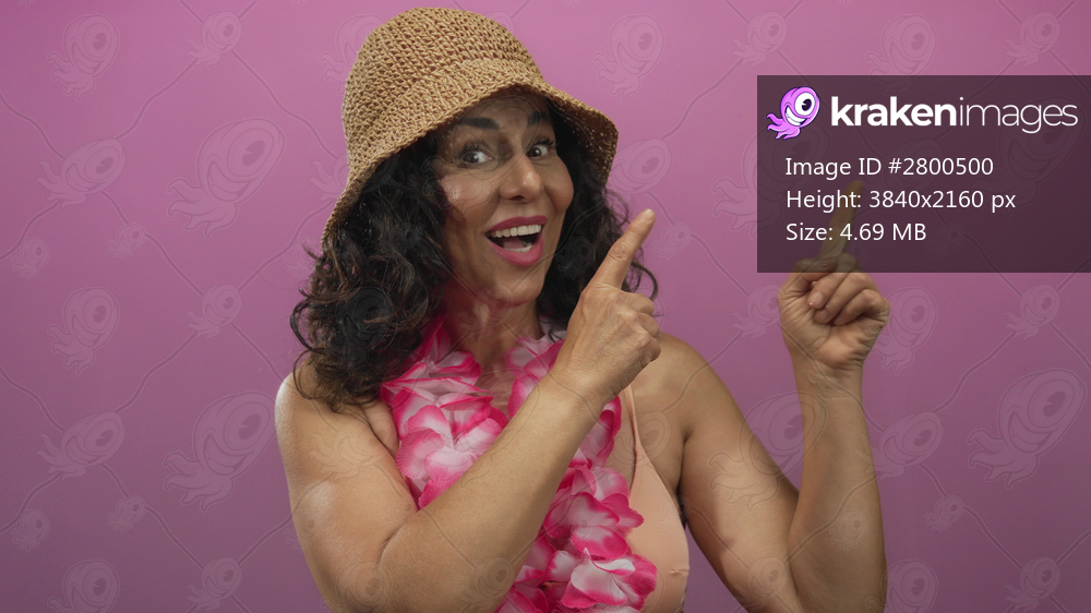 Middle age hispanic woman wearing bikini swimsuit and hawaiian lei pointing finger to side in photo studio; summer fun.